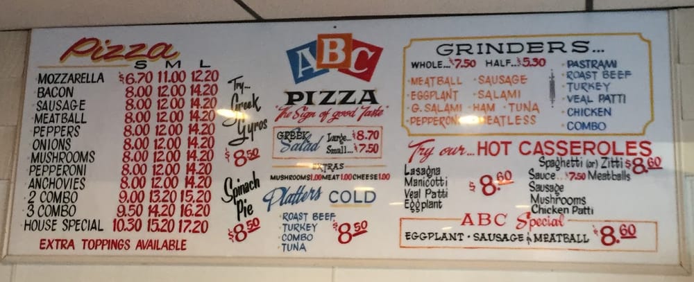 Enjoy outdoor seating, a pet-friendly environment, and the convenience of beer and wine. Whether you're stopping by for a quick bite, catering to a gathering, or simply looking for a laid-back dining experience, ABC Pizza has got you covered with friendly service and reasonable prices.